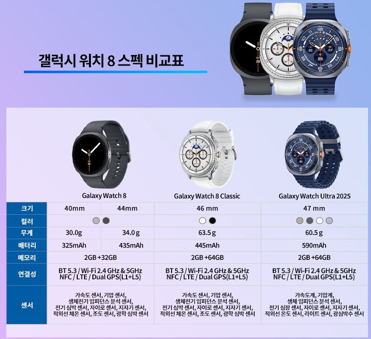 | 구분 | 40mm/44mm (기본) | 46mm (클래식) | 47mm (울트라) |