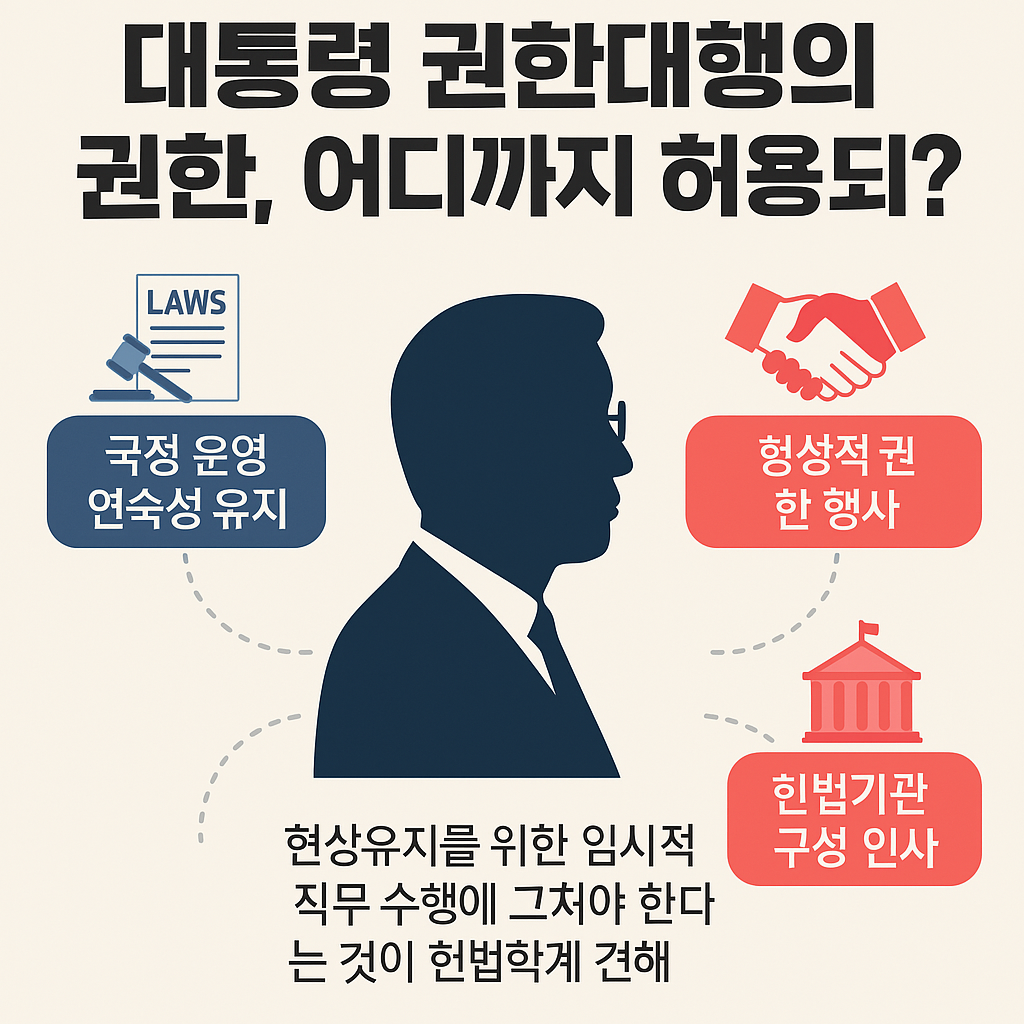 헌법학자 다수의 견해: “대통령 권한대행은 선출되지 않은 임시 행정 책임자일 뿐, 국민의 위임을 받은 대통령이 아니다. 따라서 권한 행사는 제한돼야 한다.”