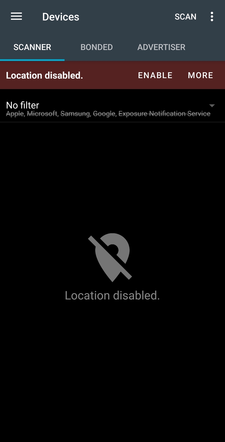 9. 그다음 위 화살표 누르고 위에 SCAN 버튼을 누르면 드디어 비콘태그를 찾아줘야 하는데 안 뜬다.