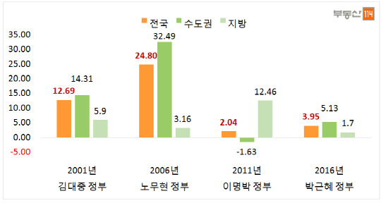 이명박 정부 시기에는 금융 위기 등의 영향으로 서울 아파트값이 약 13% 하락했습니다. 박근혜 정부 시기에는 27% 상승했지만, 앞선 민주당 정부 시기에 비하면 상승폭이 상대적으로 적었습니다.