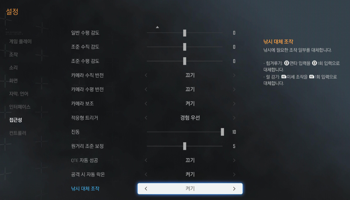 2. '접근성' 옵션 설정: 낚시 피로도 ZERO! (ㅁ 연타, R2 꾹)
