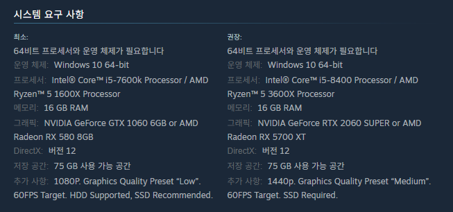 - 그래픽카드: NVIDIA GeForce RTX 2060 SUPER 또는 AMD Radeon RX 5700 XT