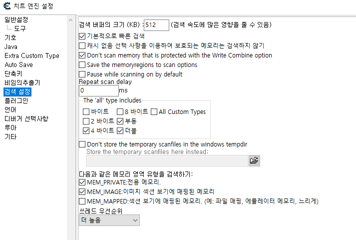 - MEM_MAPPED: 가장 중요합니다! "emulator memory"를 포함하는 영역으로, 이 옵션이 꺼져 있으면 에뮬레이터에서 돌아가는 게임의 데이터를 찾기 매우 어렵습니다.