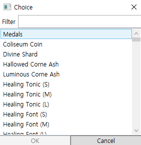 현재 가지고 있는 아이템들이 나오는데 장비는 제외하고 소비 아이템과 수집 아이템만 나옵니다.
