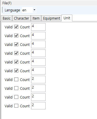 편성에 관한 수치를 변경할 수 있습니다. 4는 편성인원을 가르킵니다. v 체크는 활성화된 편성 진영이 6개라는 것입니다.