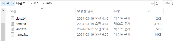에디터 파일이 있는 경로로 가면 아래와 같이 info폴더에 각종 정보를 담은 txt 파일이 존재합니다. 클래스나 아이템 이름등을 참고하면 됩니다.