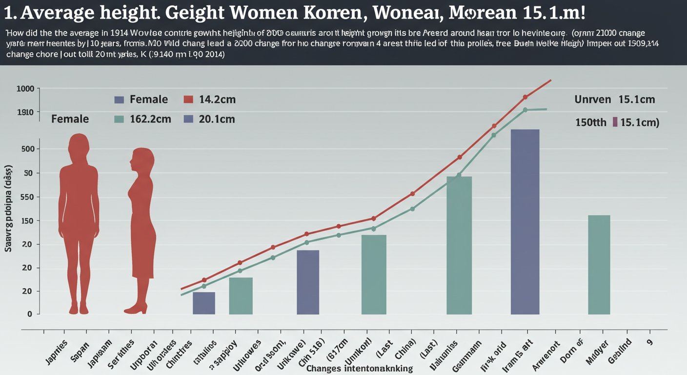 한국 여성의 평균 키는 100년 만에 20.1cm나 커져 일본(16cm), 세르비아(15.7cm), 중국(9.5cm), 미국(5cm)보다 훨씬 큰 폭의 변화를 보였습니다. 한국 남성 역시 15.1cm 성장 폭으로 이란, 그린란드에 이어 3번째로 큰 폭을 기록했습니다. 🚀