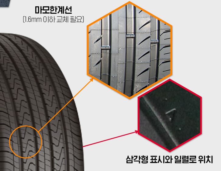 - ✔ 트레드 깊이 1.6mm 이하 무조건 교체