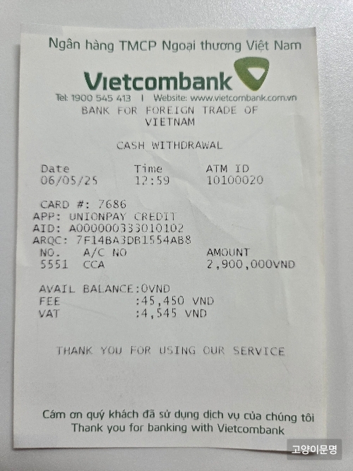 - 은행: BIDV (대부분 유니온페이 인식 가능)