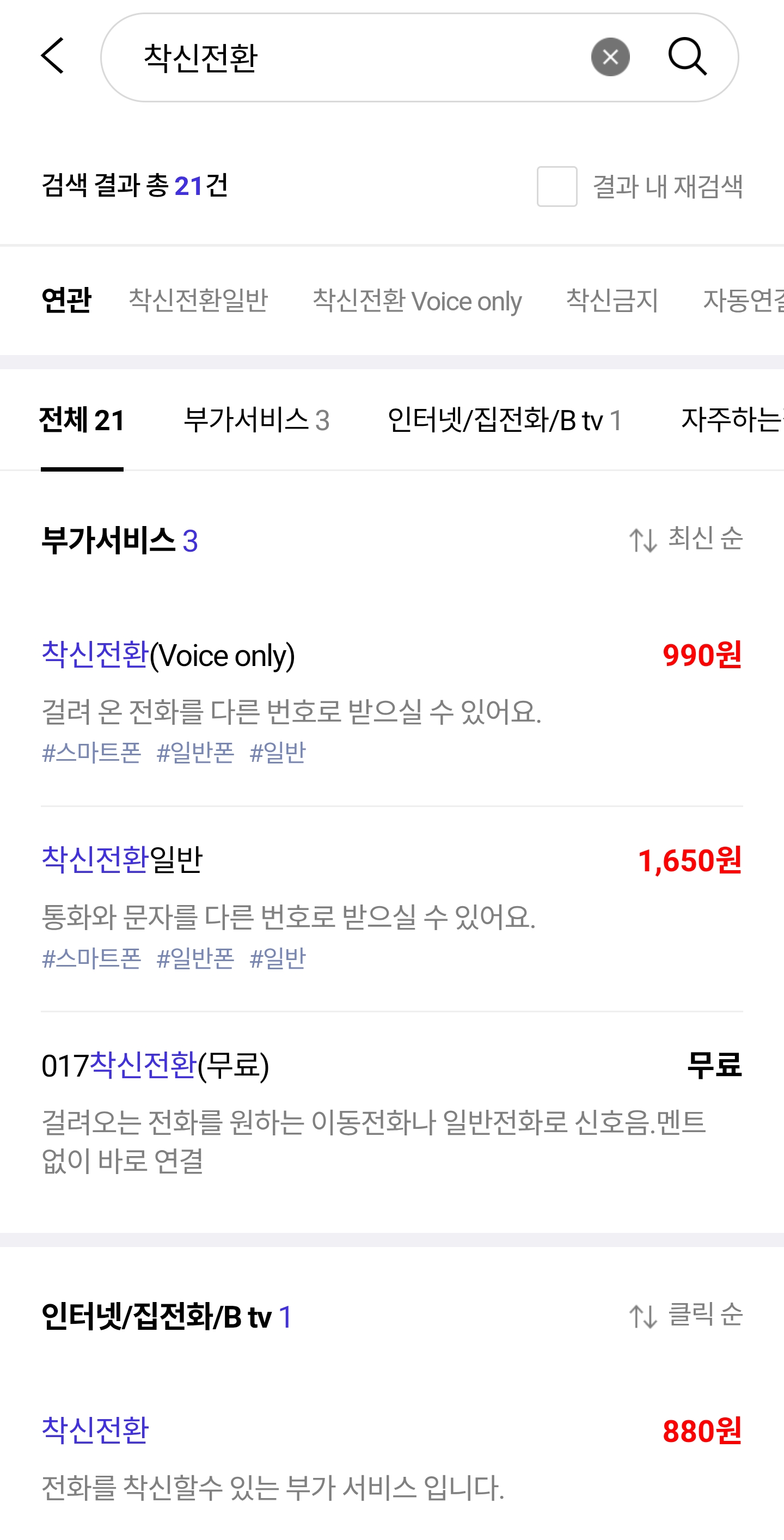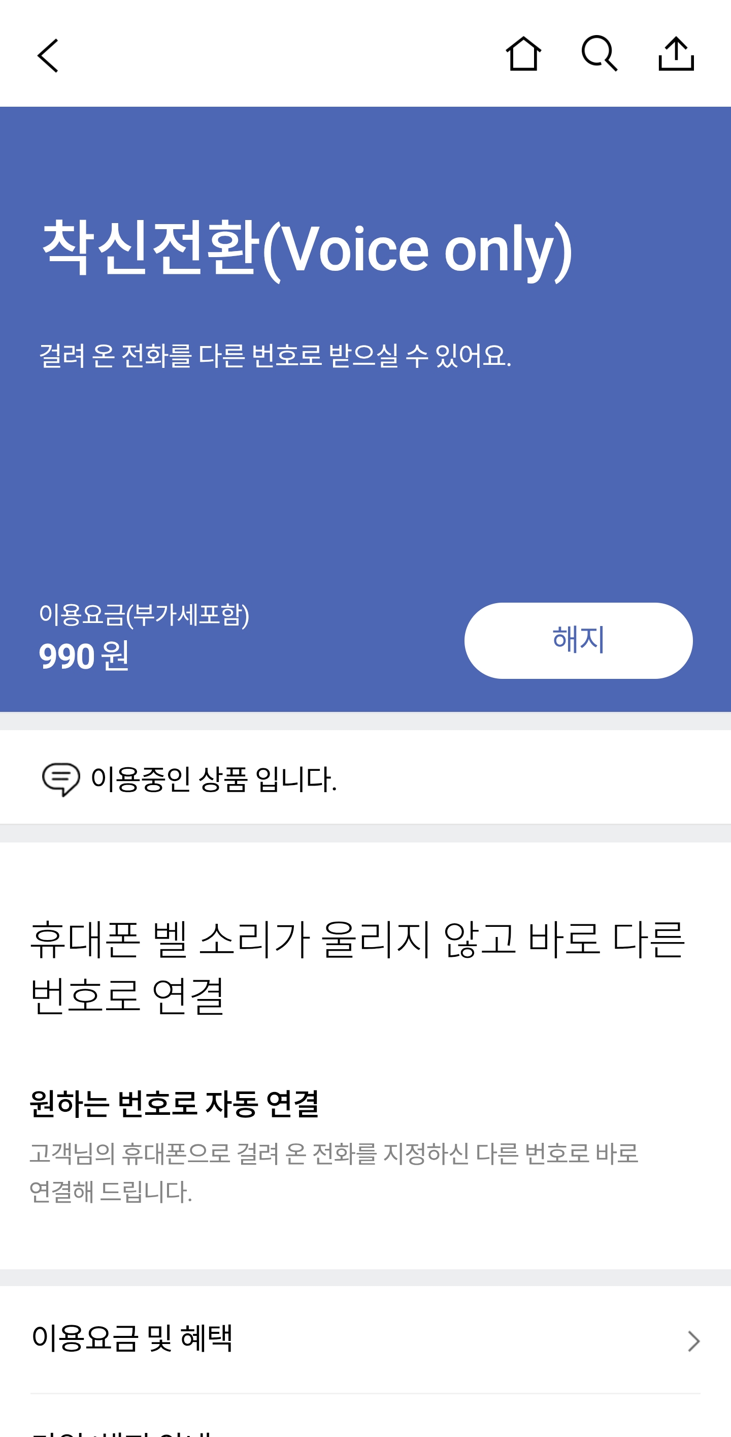 - 일부 통신사는 착신전환 서비스 유료 (월 990원) - skt의 경우 T world 앱에서 착신전환으로 검색하여 990원짜리 부가서비스에 가입하시면 됩니다.