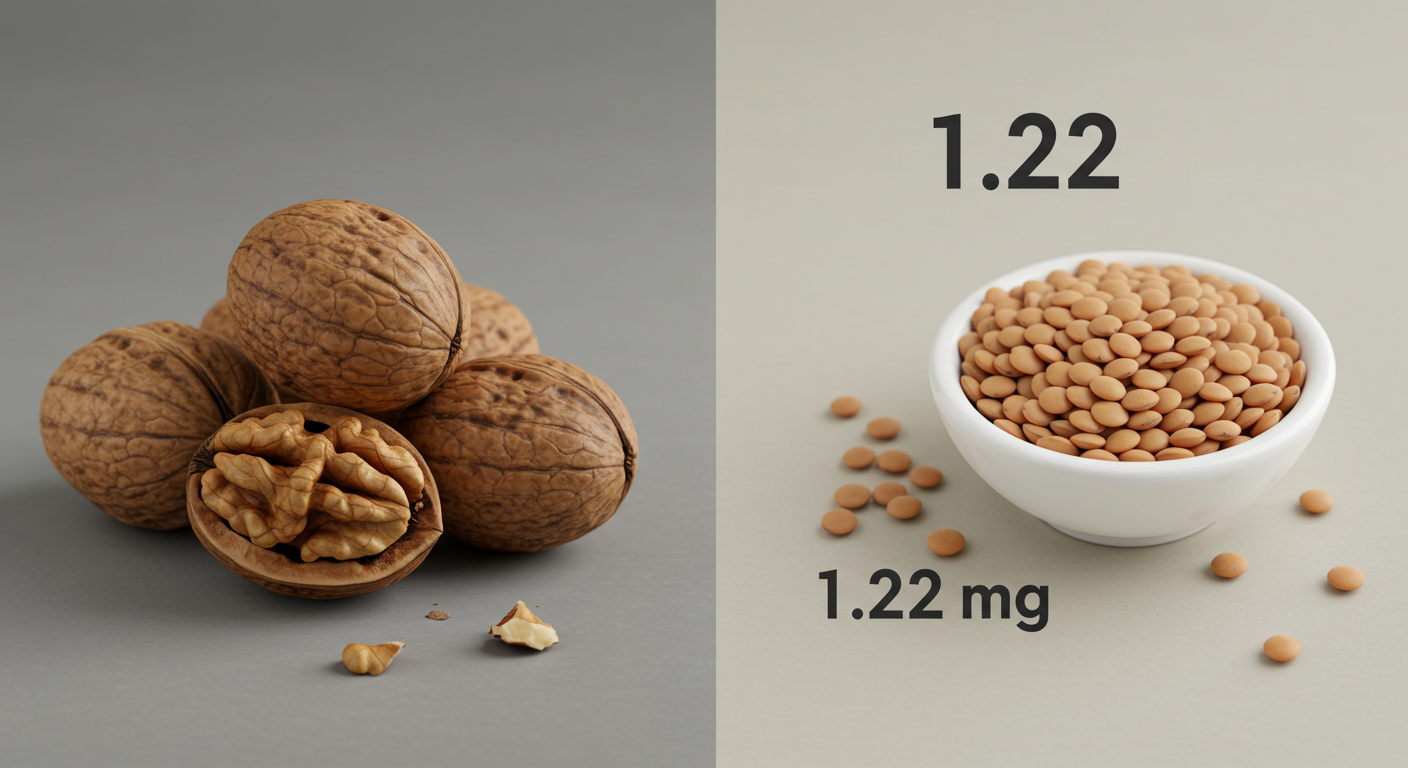 권장량: 하루 1.22mg (호두 한 줌, 렌틸콩 한 그릇) 🖐️