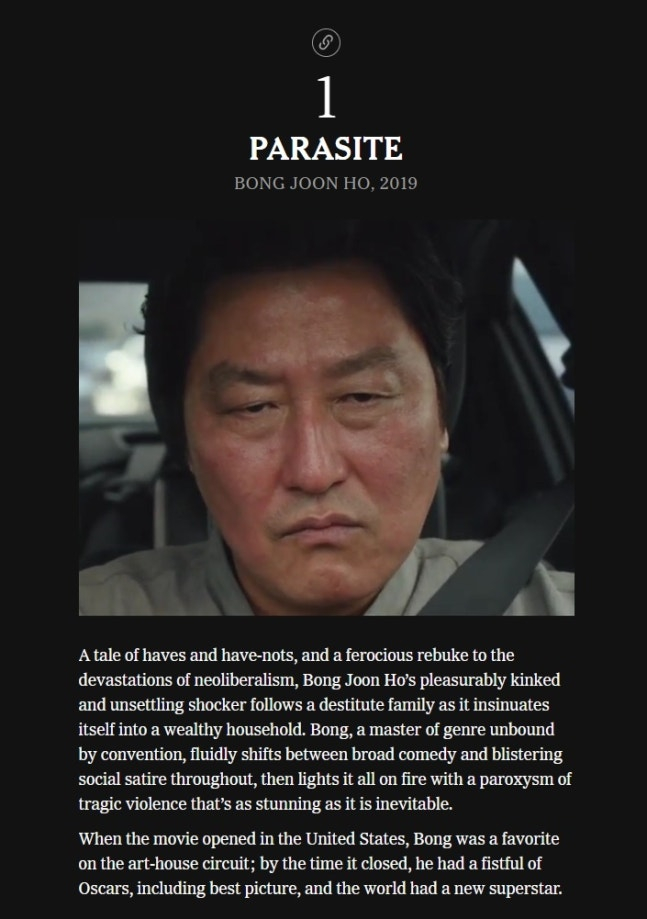 2. '기생충' 1위, '올드보이' 43위, '살인의 추억' 99위… 한국 영화 대거 포함