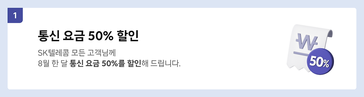 - 할인 내용: 8월 한 달간 월정액, 문자, 음성, 데이터 통화료 등 모든 통신비의 50%가 자동 할인됩니다. (별도 신청 절차는 없습니다.)